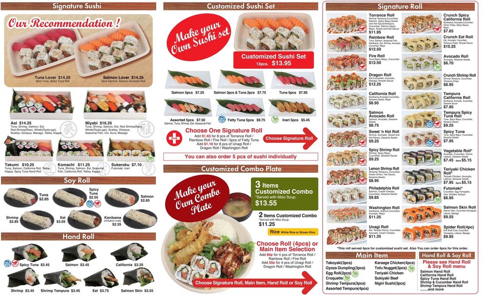 Tuna, shrimp, salmon, eel, seasonal fish, California roll, tekka, kappa.