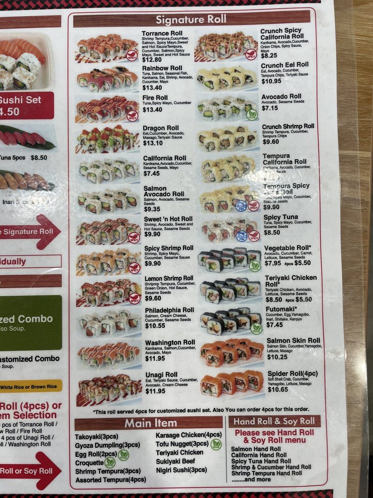 Tuna, salmon, California roll, tekka, kappa, spicy tuna hand roll.